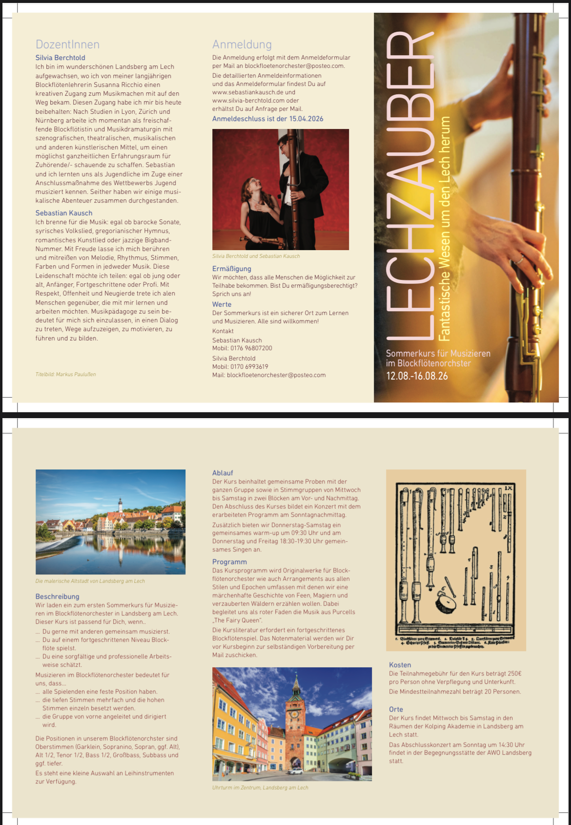 Vom 12.8.-16.8.2026 findet zum ersten Mal ein Blockflötenorchester Ferien-Kurs mit Sebastian Kausch (Blockflötist - Musikpädagoge - Sänger | Sebastian Kausch) und Silvia Berchtold in Landsberg am Lech statt. Das Anmeldeformular kann u.a. über das Kontaktformular dieser Website oder über die im Flyer angegebene E-Mail Adresse blockfloetenorchester@posteo.com angefragt werden! Anmeldefrist ist der 15.4.26. Unter dem Titel “Lechzauber” erarbeiten wir Originalwerke und Arrangements im Blockflötenorchester. Hier der Flyer zum Kurs!